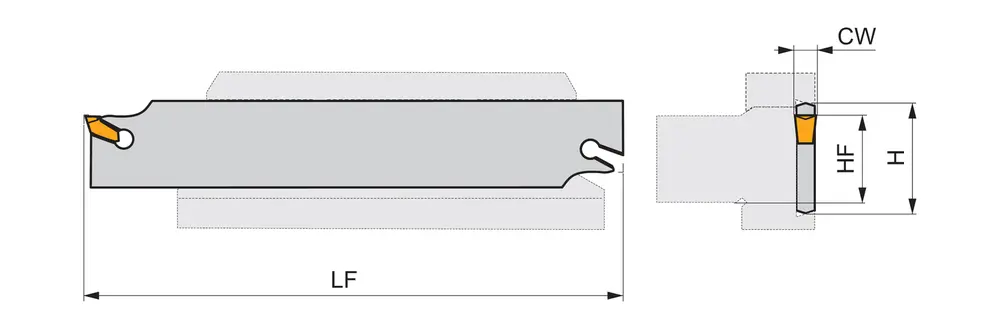 Лезвие инструмента для отрезки и проточки канавок с пружинным зажимом для крепления односторонней пластины с шириной режущей кромки 3 мм (обозначение LFMX 3.1-. ), сборка инструмента с 32-DU.. для максимальной глубины проточки 50 мм, высота лезвия инструмента 32 мм и длина 150 мм для глубокой радиальной проточки канавок, отрезки и отрезки труб.