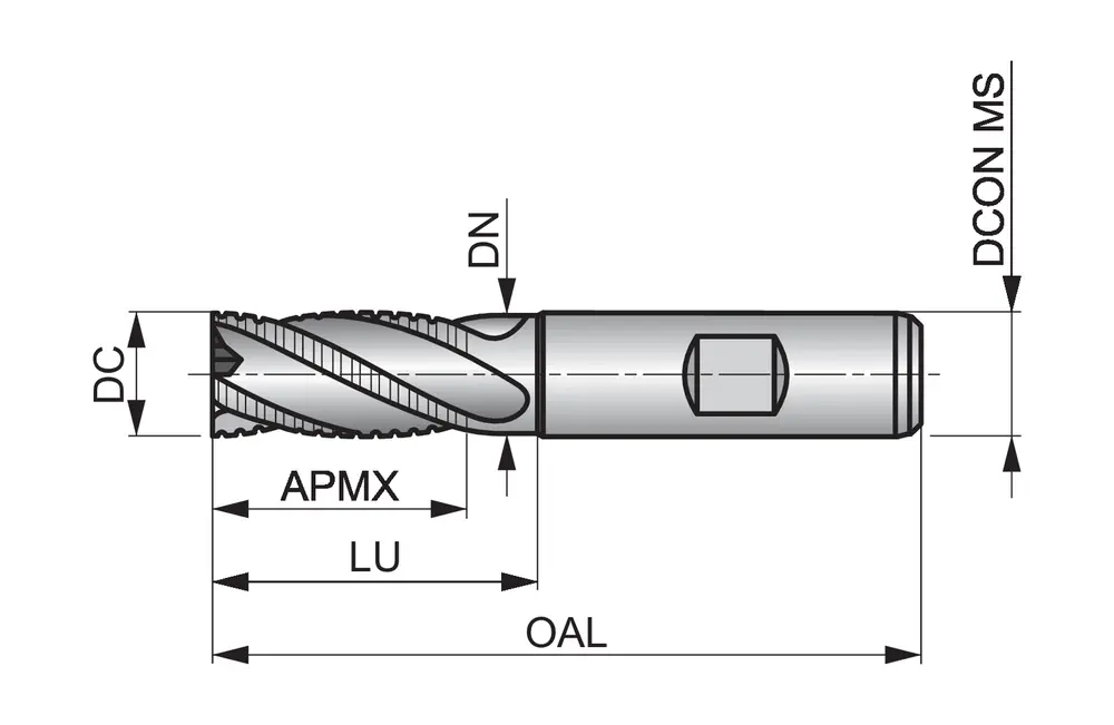 Черновая фреза короткой серии с плоским крупным шагом NF и 4 канавками, диаметром 14 мм с длиной режущей части 26 мм, общей длиной 83 мм и вылетом 37,5 мм с затылком, в соответствии со стандартом DIN 844 K с хвостовиком Weldon 12 мм, из быстрорежущей стали HSS-E на основе кобальта с блестящей отделкой, углом подъема спирали 30° и передним углом 12° для фрезерования уступов, фрезерования пазов и обработки под углом в обработке на станке и в обычной углеродистой стали, а также меди или медных сплавов.