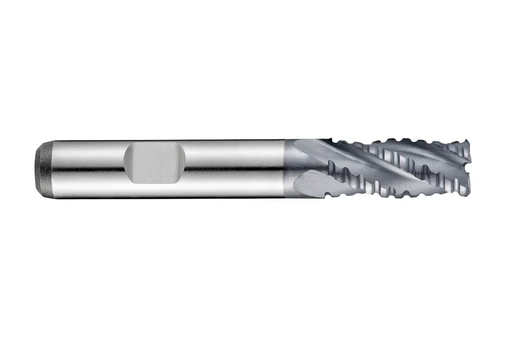 Черновая фреза короткой серии с плоским крупным шагом NF и 4 канавками, диаметром 16 мм с длиной режущей части 32 мм, общей длиной 92 мм и вылетом 43,5 мм с затылком, в соответствии со стандартом DIN 844 K с хвостовиком Weldon 16 мм, из быстрорежущей стали HSS-E на основе кобальта с покрытием TiCN, углом подъема спирали 30° и передним углом 12° для фрезерования уступов, фрезерования пазов и врезания под углом при обработке на станке, из обычной углеродистой и легированной стали, чугуна, меди или медных сплавов