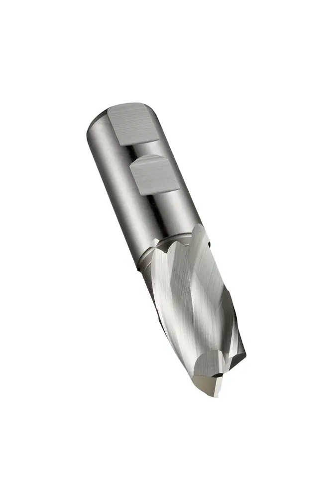 Сверло для обработки пазов сверхкороткой серии с 2 канавками, диаметром 1 дюйм, длиной режущей части 26 мм, общей длиной 102 мм и вылетом 45,5 мм с затылком, соответствует стандарту DIN 327 D, с хвостовиком Weldon 25 мм, из порошковой металлургической стали HSS-E с блестящей отделкой, углом наклона спирали 30° и передним углом 12° для фрезерования уступов, фрезерования пазов и обработки под углом в стали, меди или медных сплавах, легкообрабатываемых резанием.
