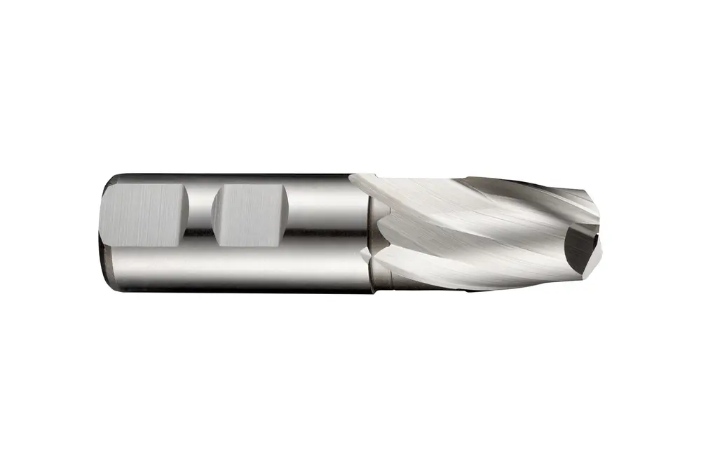 Сверло для обработки пазов сверхкороткой серии с 2 канавками, диаметром 24 мм, длиной режущей части 26 мм, общей длиной 102 мм и вылетом 45,5 мм с затылком, в соответствии со стандартом DIN 327 D с хвостовиком Weldon 25 мм, из порошковой металлургической стали HSS-E с блестящей отделкой, углом наклона спирали 30° и передним углом 12° для фрезерования уступов, фрезерования пазов и обработки под углом в стали, меди или медных сплавах, легкообрабатываемых резанием