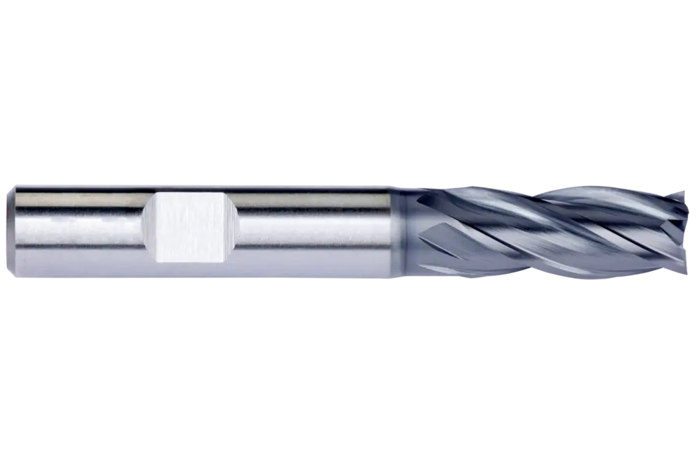 Короткая концевая фреза с 4 канавками, диаметром 10 мм, длиной резания 22 мм, общей длиной 72 мм и вылетом 31,5 мм с зачисткой шейки, в соответствии со стандартом DIN 844 K, с хвостовиком Weldon 10 мм, порошковая металлургическая быстрорежущая сталь HSS-E с покрытием TiCN, угол наклона спирали 30° и угол заточки 12°, для фрезерования плеч, пазов и обработки наклонных поверхностей при свободной обработке, для низкоуглеродистой и легированной стали, чугуна, меди или медных сплавов, а также титана или титановых сплавов.