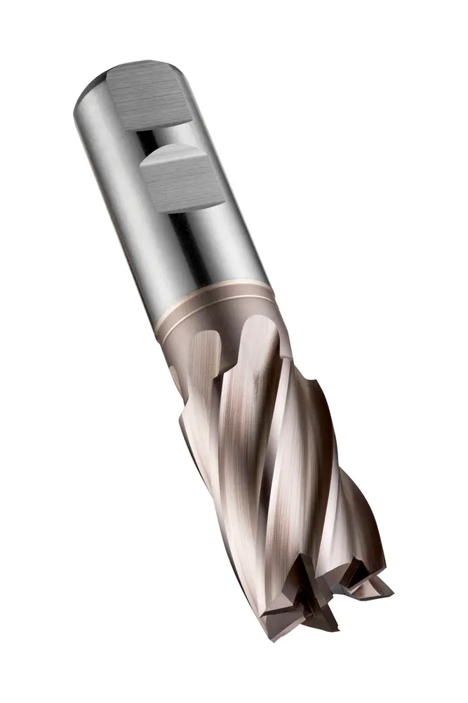 Короткая концевая фреза с 5 канавками, диаметром 25 мм, длиной резания 45 мм, общей длиной 121 мм и вылетом 64,5 мм с зачисткой шейки, в соответствии со стандартом DIN 844 K, с хвостовиком Weldon 25 мм, порошковая металлургическая быстрорежущая сталь HSS-E с покрытием TiCN, угол наклона спирали 30° и угол заточки 12°, для фрезерования плеч, пазов и обработки наклонных поверхностей при свободной обработке, для низкоуглеродистой и легированной стали, чугуна, меди или медных сплавов, а также титана или титановых сплавов.