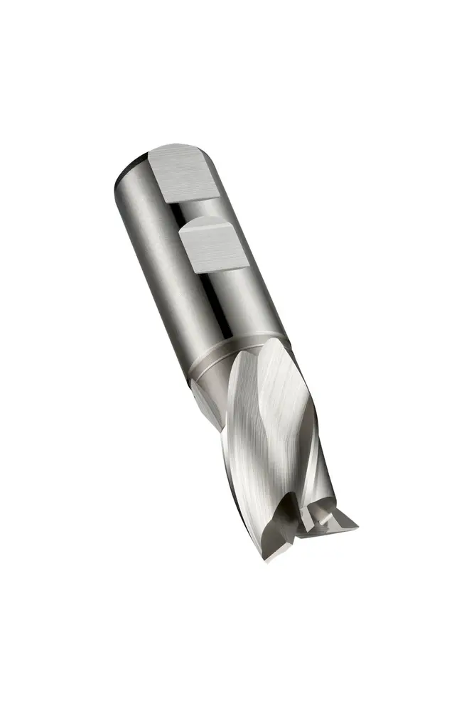 Сверло для обработки пазов сверхкороткой серии с 3 канавками, диаметром 30 мм, длиной режущей части 26 мм, общей длиной 102 мм и вылетом 45,5 мм с затылком, в соответствии со стандартом DIN 327 D с хвостовиком Weldon 25 мм, из порошковой металлургической стали HSS-E с блестящей отделкой, углом наклона спирали 30° и передним углом 12° для фрезерования уступов, фрезерования пазов и обработки под углом в обработке на станке и в обычной углеродистой стали, а также меди или медных сплавах.