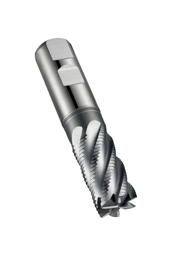 Черновая фреза короткой серии с асимметричным мелкошаговым профилем HRA и 6 канавками, диаметром 28 мм с длиной режущей части 45 мм, общей длиной 121 мм и вылетом 64,5 мм с затылком, в соответствии со стандартом DIN 844 K с хвостовиком Weldon 25 мм, порошковая металлургическая HSS-E с покрытием Alcrona, углом подъема спирали 35° и передним углом 12° для фрезерования уступов, фрезерования пазов и обработки под углом в легированной и инструментальной стали, нержавеющей стали, чугуне, меди или медных сплавах, а также жаропрочных сплавах.