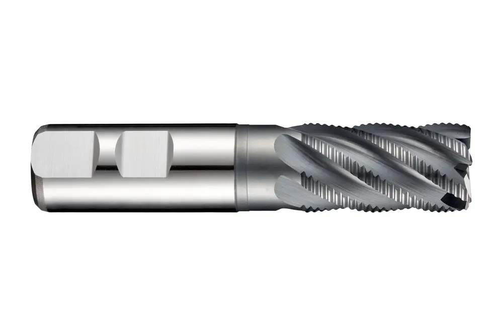 Черновая фреза короткой серии с асимметричным мелкошаговым профилем HRA и 6 канавками, диаметром 32 мм с длиной режущей части 53 мм, общей длиной 133 мм и вылетом 72,5 мм с затылком, в соответствии со стандартом DIN 844 K с хвостовиком Weldon 32 мм, порошковая металлургическая HSS-E с покрытием Alcrona, углом подъема спирали 35° и передним углом 12° для фрезерования уступов, фрезерования пазов и обработки под углом в легированной и инструментальной стали, нержавеющей стали, чугуне, меди или медных сплавах, а также жаропрочных сплавах.