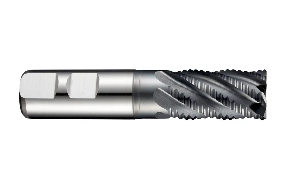 Черновая фреза короткой серии с асимметричным крупным шагом NRA и 6 канавками, диаметром 30 мм с длиной режущей части 45 мм, общей длиной 121 мм и вылетом 64,5 мм с затылком, в соответствии со стандартом DIN 844 K с хвостовиком Weldon 25 мм, из порошковой металлургической стали HSS-E с покрытием Alcrona, углом подъема спирали 35° и передним углом 12° для фрезерования уступов, фрезерования пазов и обработки под углом в обычной углеродистой, легированной и инструментальной стали, нержавеющей стали, чугуне, меди или медных сплавах, а также жаропрочных сплавах.