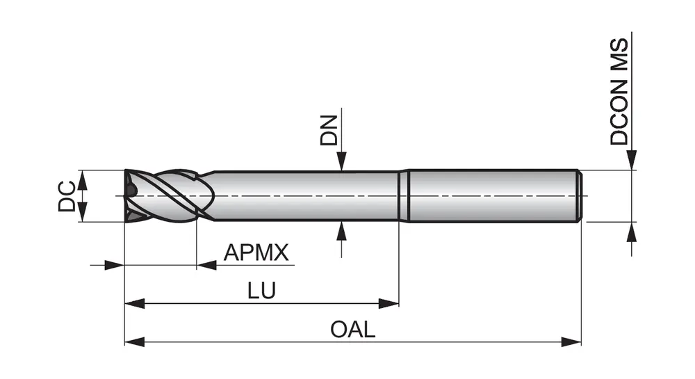 Сверхкороткая концевая фреза с 4 канавками, диаметром 6 мм, длиной резания 10 мм, общей длиной 75 мм и вылетом 40 мм с зачисткой шейки, в соответствии со стандартом Dormer Pramet, с гладким хвостовиком 6 мм, из твердого сплава с покрытием AlTiN, углом спирали 40° и углом заточки 3°, для фрезерования и врезания в мартенситные, аустенитные и супераустенитные, дуплексные или дисперсионно-упрочняемые нержавеющие стали и высокотемпературные сплавы.