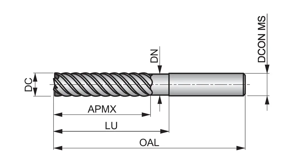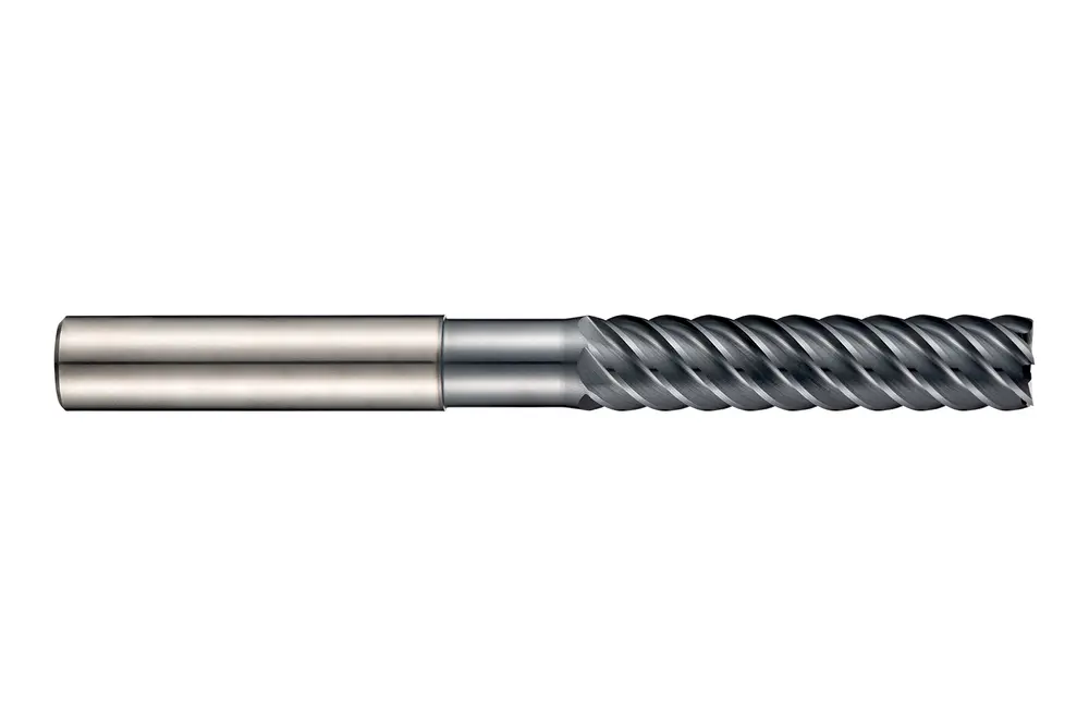 Длинная серия концевых фрез для чистовой обработки с 8 канавками, диаметром 20 мм, длиной режущей части 57 мм, общей длиной 125 мм и вылетом 85 мм с затылком, в соответствии со стандартом Dormer Pramet, с гладким хвостовиком 20 мм, цельный твердосплавный с покрытием AlTiN, углом наклона спирали 50° и передним углом 3° для фрезерования уступов в мартенситных, аустенитных и супераустенитных, дуплексных или дисперсионно-твердеющих нержавеющих сталях и жаропрочных сплавах.
