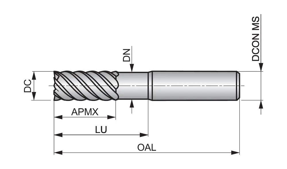 Фреза концевая чистовая короткая серия с 6 канавками, диаметром 3 мм, длиной режущей части 8 мм, общей длиной 50 мм и вылетом 20 мм с затылком, в соответствии со стандартом Dormer Pramet, с цилиндрическим хвостовиком 6 мм, цельная твердосплавная с покрытием TiSiN, углом наклона спирали 50° и передним углом -26° для фрезерования уступов в закаленных материалах