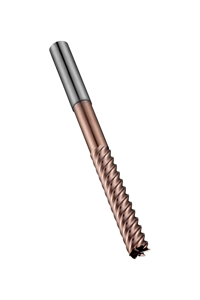 Концевая фреза для чистовой обработки сверхдлинной серии с 8 канавками, диаметром 20 мм, длиной режущей части 75 мм, общей длиной 150 мм и вылетом 110 мм с затылком, в соответствии со стандартом Dormer Pramet, с цилиндрическим хвостовиком 20 мм, цельная твердосплавная с покрытием TiSiN, углом наклона спирали 50° и передним углом -26° для фрезерования уступов в закаленных материалах