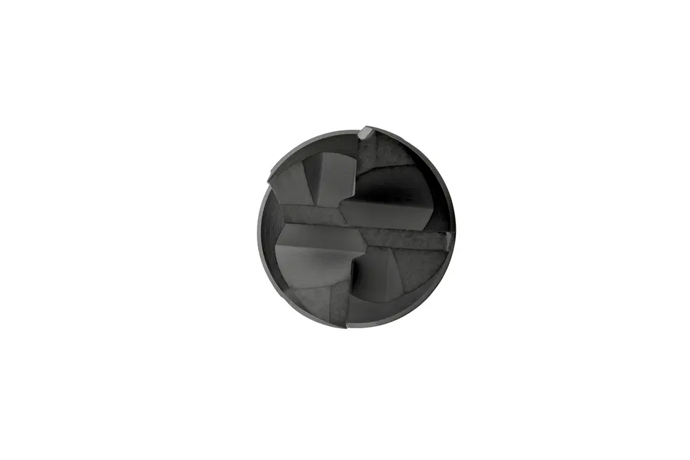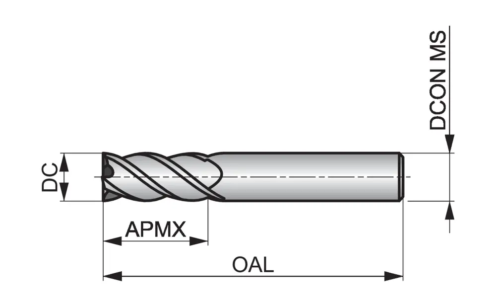 Короткая концевая фреза с 4 канавками, диаметром 5 мм, длиной резания 15 мм и общей длиной 50 мм, по стандарту Dormer Pramet, с гладким хвостовиком 5 мм, из твердого сплава с алмазным покрытием, углом наклона спирали 40° и углом заточки 10° для фрезерования плеч и погружения в графит.
