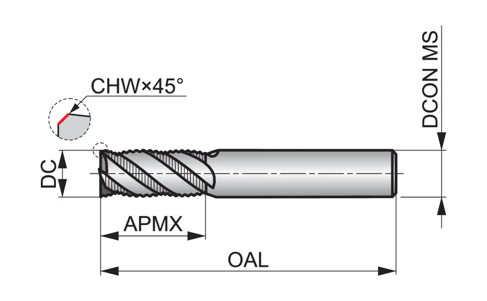 Черновая концевая фреза короткой серии с профилем NR с обычным крупным шагом и 4 канавками, диаметром 16 мм, длиной режущей части 32 мм, общей длиной 90 мм и скошенными под углом 45° 0,3 мм угловыми кромками, в соответствии со стандартом Dormer Pramet, с гладким хвостовиком 16 мм, цельная твердосплавная с покрытием AlCrN, углом спирали 40° с неравномерным шагом и передним углом 10° для фрезерования уступов в стали и стальном литье, ферритной, мартенситной и аустенитной нержавеющей стали, чугуне и жаропрочных сплавах