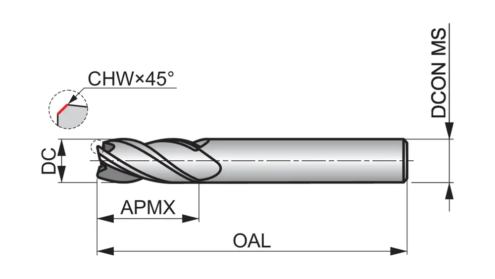 Короткая концевая фреза с 4 канавками, диаметром 20 мм, длиной резания 38 мм, общей длиной 104 мм и скошенными под углом 45° кромками толщиной 0,4 мм, в соответствии со стандартом Dormer Pramet, с гладким хвостовиком 20 мм, из твердого сплава с покрытием TiSiN, неравномерной спиралью с дифференциальным шагом и углом заточки 10°, предназначена для фрезерования плеч, врезания, прогрессивного врезания и трохоидального фрезерования стали и литой стали, ферритной, мартенситной и аустенитной нержавеющей стали, чугуна и высокотемпературных сплавов.
