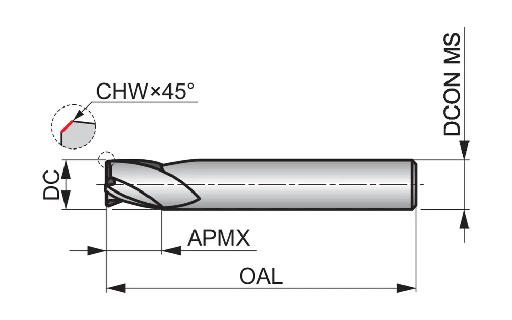 Сверло для обработки пазов сверхкороткой серии с 3 канавками, диаметром 3,8 мм с длиной режущей части 5 мм, общей длиной 54 мм и скошенными под углом 45° 0,08 мм углами, в соответствии со стандартом DIN 6527 K с цилиндрическим хвостовиком 6 мм, цельное твердосплавное с покрытием AlCrN, углом подъема спирали 28° и передним углом 9° для фрезерования уступов, врезного фрезерования, фрезерования пазов и обработки под углом в стали и стальном литье, ферритной, мартенситной и аустенитной нержавеющей стали, чугуне и алюминиевом литье, а также меди или медных сплавах.