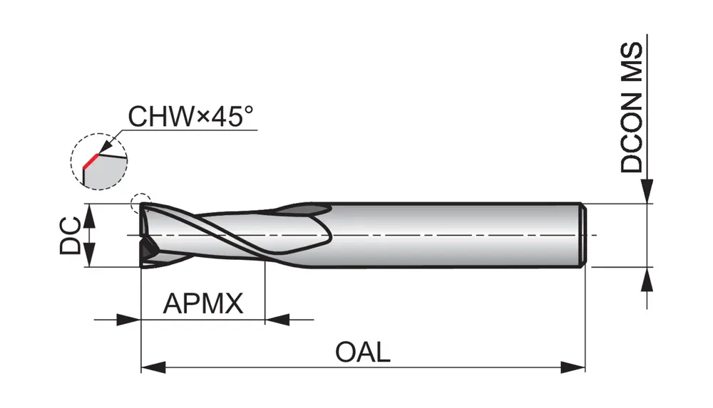 Короткое шлицевое сверло с 2 канавками, диаметром 20 мм с длиной режущей части 32 мм, общей длиной 104 мм и скошенными под углом 45° 0,3 мм углами, в соответствии со стандартом DIN 6527 L с цилиндрическим хвостовиком 20 мм, цельный твердосплавный с покрытием AlCrN, углом подъема спирали 28° и передним углом 9° для фрезерования пазов и обработки наклонных поверхностей в стали и литой стали, нержавеющей стали, чугуне, кованых деталях, литом алюминии и меди или медных сплавах, а также жаропрочных сплавах.
