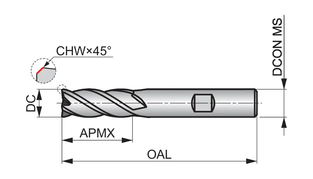 Короткая концевая фреза с 4 канавками, диаметром 3 мм, длиной резания 8 мм, общей длиной 57 мм и скошенными под углом 45° кромками толщиной 0,08 мм, в соответствии со стандартом DIN 6527 L, с хвостовиком Weldon 6 мм, из твердого сплава с покрытием AlCrN, углом спирали 34° и углом заточки 9°, предназначена для фрезерования и врезания в сталь и литую сталь, ферритную и мартенситную нержавеющую сталь, чугун и медь или медные сплавы.