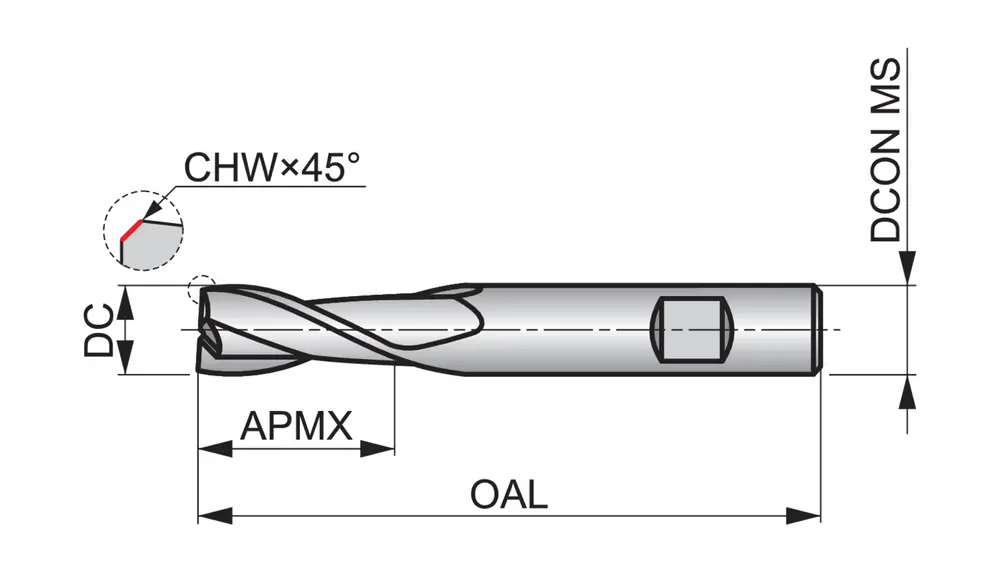 Концевая фреза стандартной длины с 2 канавками, диаметром 6 мм, длиной режущей части 19 мм, общей длиной 57 мм и скошенными под углом 45° 0,13 мм угловыми кромками, в соответствии со стандартом Dormer Pramet, с хвостовиком Weldon 6 мм, цельнотвердосплавная с покрытием TiAlN, углом подъема спирали 30° и передним углом 12° для фрезерования пазов в стали и стальном литье, чугуне и алюминиевом литье, а также меди или медных сплавах.