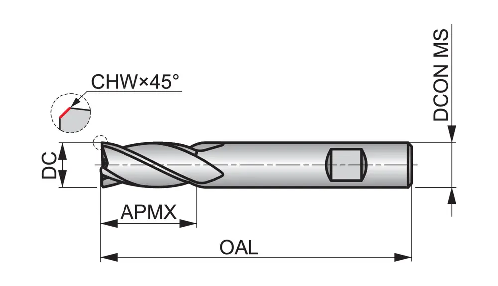 Стандартная концевая фреза с 4 канавками, диаметром 18 мм, длиной резания 32 мм, общей длиной 92 мм и скошенными под углом 45° кромками толщиной 0,2 мм, в соответствии со стандартом Dormer Pramet, с хвостовиком Weldon 18 мм, из твердого сплава с покрытием TiAlN, углом спирали 30° и углом заточки 12°, для фрезерования плечевых поверхностей в стали и литой стали, чугуне и литом алюминии, а также в меди или медных сплавах.