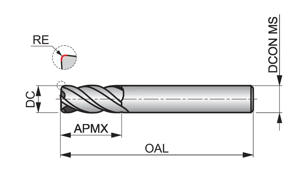 Короткая серия концевых фрез с закругленными углами, 4 канавками, диаметром 10 мм, длиной резания 22 мм, общей длиной 72 мм и закруглением углов 1 мм, в соответствии со стандартом Dormer Pramet, с гладким хвостовиком 10 мм, из твердого сплава с покрытием AlCrN, спиралью 40° с дифференциальным шагом и углом заточки 4°, для фрезерования плеч, врезания, прогрессивного врезания, наклонного и спирального фрезерования в мартенситных, аустенитных и супераустенитных, дуплексных или дисперсионно-упрочняемых нержавеющих сталях, высокотемпературных сплавах, закаленном чугуне и закаленной стали <55HRC.