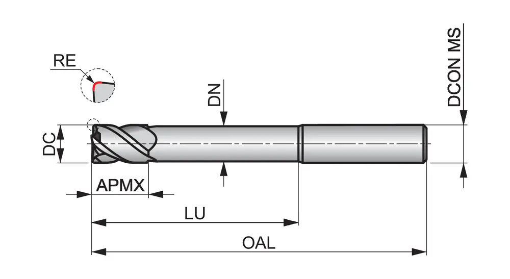 Сверхкороткая серия концевых фрез с закругленными углами, 4 канавки, диаметр 4 мм, длина резания 8 мм, общая длина 75 мм, вылет 32 мм с закруглением шейки и радиус закругления 0,5 мм, в соответствии со стандартом Dormer Pramet, с гладким хвостовиком 6 мм, из твердого сплава с покрытием TiSiN, спиральным углом 40° и углом заточки -6°, для фрезерования плеч, врезания, прогрессивного врезания, наклонного и спирального фрезерования в закаленных материалах.