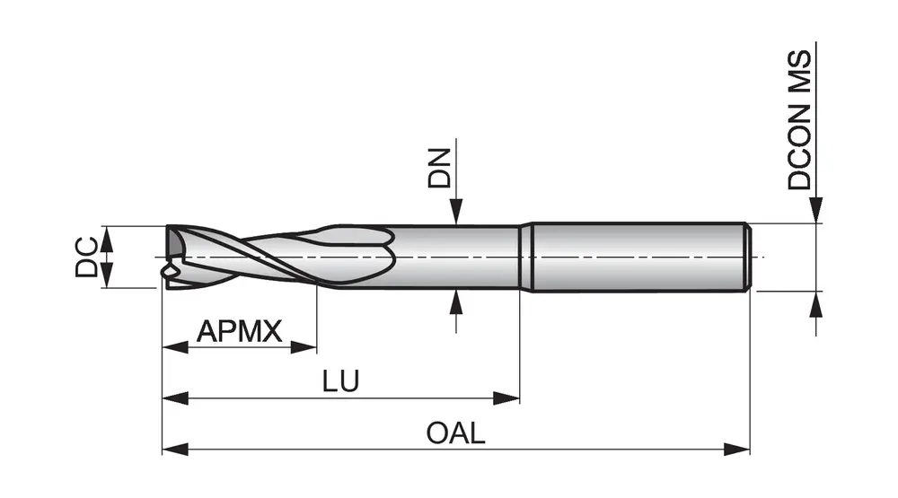 Концевая фреза короткой серии с 2 канавками, диаметром 4 мм, длиной режущей части 12 мм, общей длиной 50 мм, вылетом 20 мм с затылком и радиусом скругления 0,1 мм, в соответствии со стандартом Dormer Pramet, с гладким хвостовиком 6 мм, цельная твердосплавная с полированной отделкой, углом наклона 30° и передним углом 20° для фрезерования уступов, фрезерования пазов, обработки наклонных поверхностей и винтового фрезерования в цветных металлах.