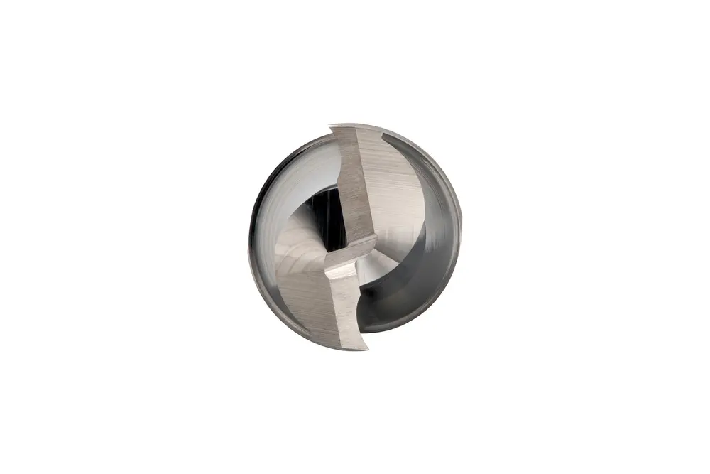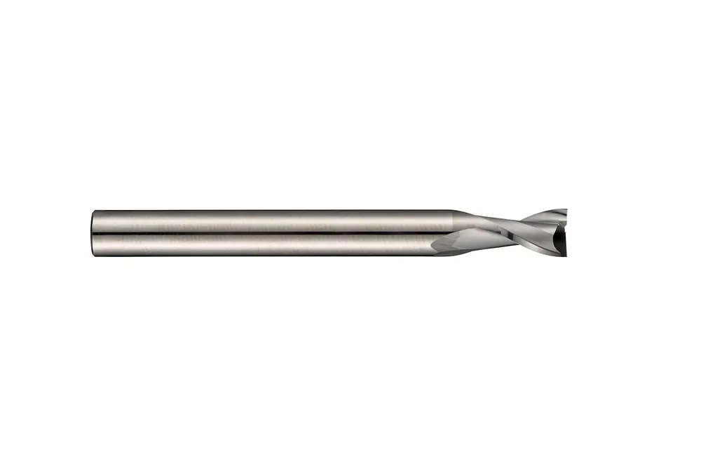 Концевая фреза сверхкороткой серии с 2 канавками, диаметром 8,2 мм, длиной режущей части 10 мм, общей длиной 100 мм и радиусом скругления углов 0,1 мм, в соответствии со стандартом Dormer Pramet, с цилиндрическим хвостовиком 8 мм, цельная твердосплавная с полированной отделкой, углом наклона спирали 30° и передним углом 20° для фрезерования уступов и пазов в цветных металлах.