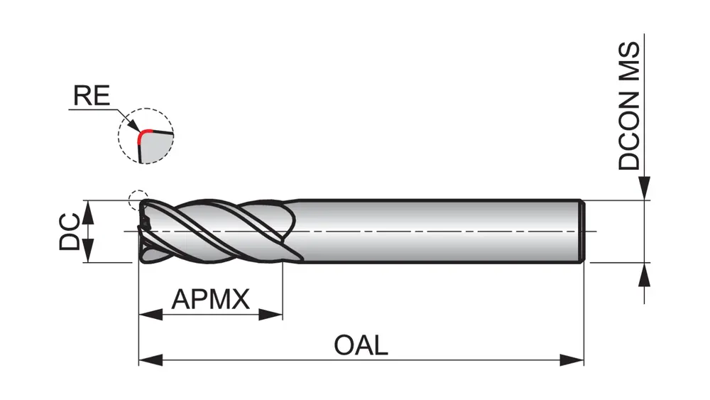 Короткая серия концевых фрез с закругленными углами, 4 канавками, диаметром 16 мм, длиной резания 32 мм, общей длиной 92 мм и закругленными углами 3 мм, по стандарту Dormer Pramet, с гладким хвостовиком 16 мм, из цельного твердосплава с полированной поверхностью, углом спирали 40° и углом заточки 10°, для фрезерования плеч, врезания, наклона и спирального фрезерования в цветных металлах.