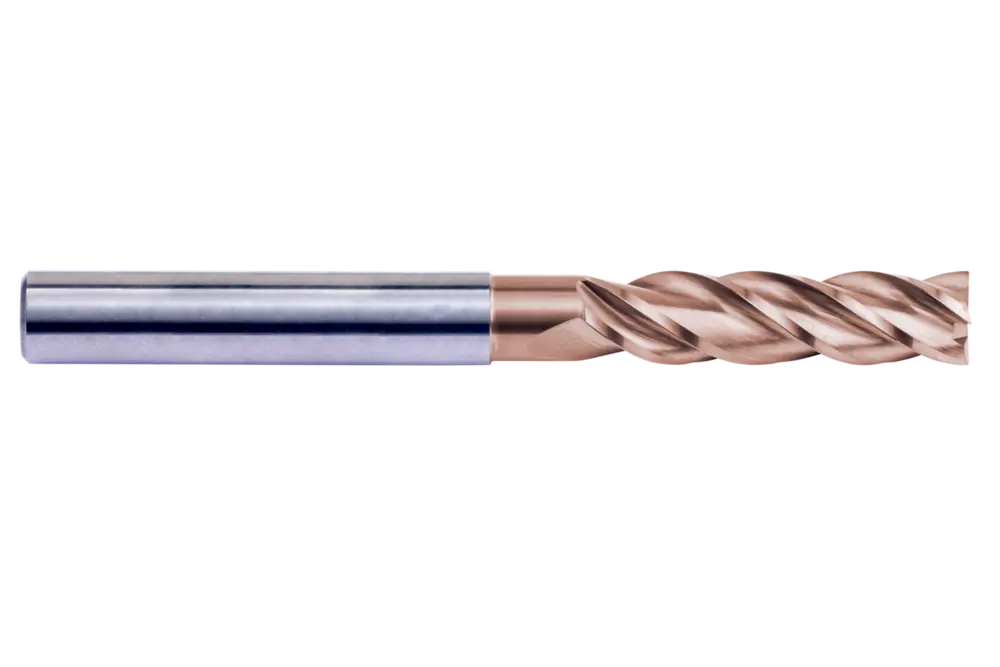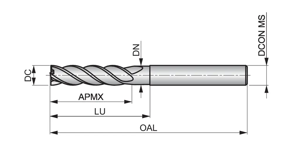 Длинная концевая фреза с 4 канавками, диаметром 16 мм, длиной резания 65 мм, общей длиной 125 мм, вылетом 75 мм с закруглением шейки и радиусом скругления углов 0,3 мм, по стандарту Dormer Pramet, с гладким хвостовиком 16 мм, из твердого сплава с покрытием TiSiN, неравномерной спиралью и углом заточки 10°, предназначена для фрезерования и врезания в сталь, литую сталь, нержавеющую сталь, чугун или высокотемпературные сплавы.