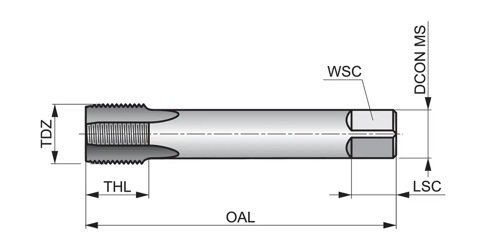 Метчик с прямой канавкой и фаской формы C, с шагом 2-3xP, для трубной резьбы G 1/8" по британскому стандарту с шагом 28 нитей на дюйм и классом точности Normal, размеры по стандарту DIN 5156, с хвостовиком 7,0 мм и квадратным приводом 5,5 мм, из порошковой металлургической стали HSS-E с блестящей отделкой для нарезания резьбы 1,5xD в сквозных или глухих отверстиях в стали с автоматической и обычной обработкой резанием.