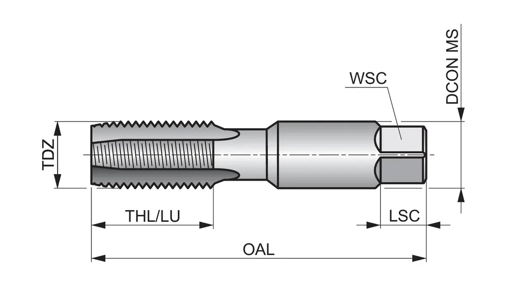 Метчик с прямой канавкой и фаской формы C, с шлицем 2-3xP, для национальной трубной прямой резьбы для механических соединений NPSM1/8" с 27 витками на дюйм и нормальным классом посадки, размеры соответствуют стандарту ANSI B94.9 с хвостовиком 11,1 мм и квадратным приводом 8,3 мм, из быстрорежущей стали с блестящей отделкой для нарезания резьбы 1,5xD в сквозных или глухих отверстиях в стали, обработанной на станке, а также в легированной стали, меди или медных сплавах.