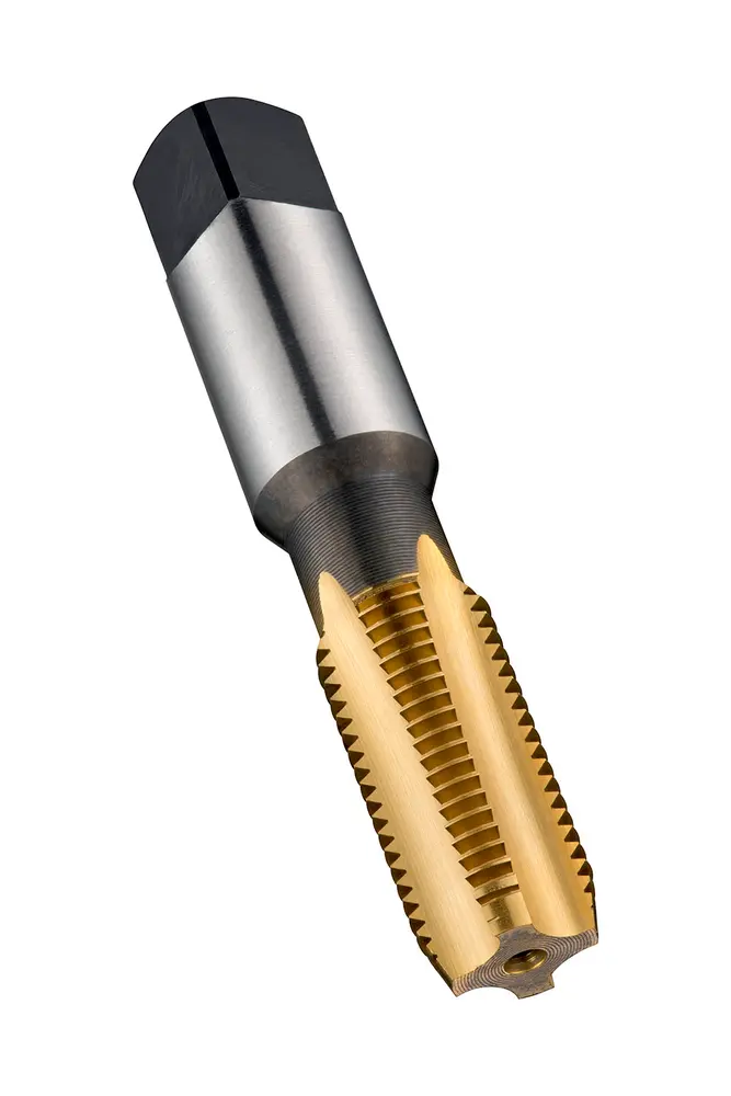 Метчик с прямой канавкой №3 с выводом заглушки 2-3xP, для национальной трубной цилиндрической резьбы (Dryseal) для топливопроводов NPSF 1/4" с 18 TPI и нормальным классом посадки, размеры соответствуют стандарту ~ANSI B94.9 с хвостовиком 14,3 мм и квадратным приводом 10,7 мм, из быстрорежущей стали с покрытием TiN для сквозных или глухих отверстий 1,5xD в легированной стали, чугуне, меди или медных сплавах.