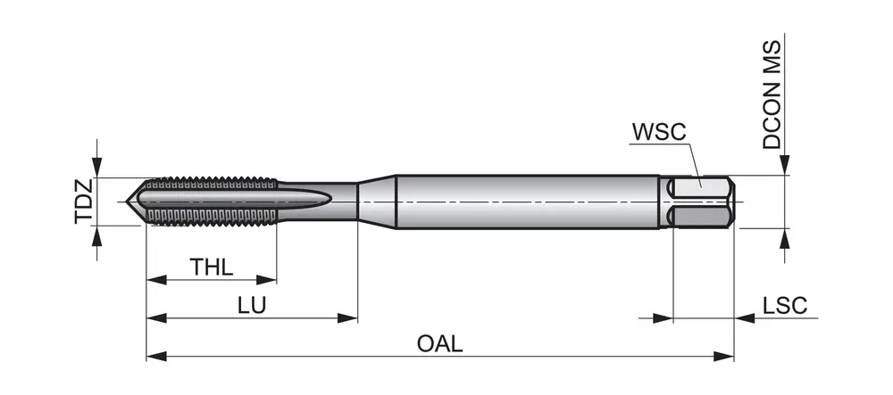Метчик с прямой канавкой и фаской формы C, с шлицем 2-3xP, для унифицированной национальной мелкой резьбы UNF 1/4", с шагом 28 витков на дюйм и классом точности 2B, размеры по стандарту DIN 371, с хвостовиком 7,0 мм и квадратным приводом 5,5 мм, из порошковой быстрорежущей стали HSS-E с блестящей поверхностью для нарезания сквозной или глухой резьбы 1,5xD в углеродистой стали с автоматической и обычной обработкой.