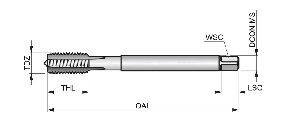 Метчик с прямой канавкой и фаской формы C, с шагом 2-3xP, для унифицированной национальной крупной резьбы UNC 9/16", шагом 12 витков на дюйм и классом точности 2B, размеры по стандарту DIN 376, с хвостовиком 11,0 мм и квадратным приводом 9,0 мм, из порошковой быстрорежущей стали HSS-E с блестящей поверхностью для нарезания сквозной или глухой резьбы 1,5xD в углеродистой стали с автоматической и обычной обработкой резанием.