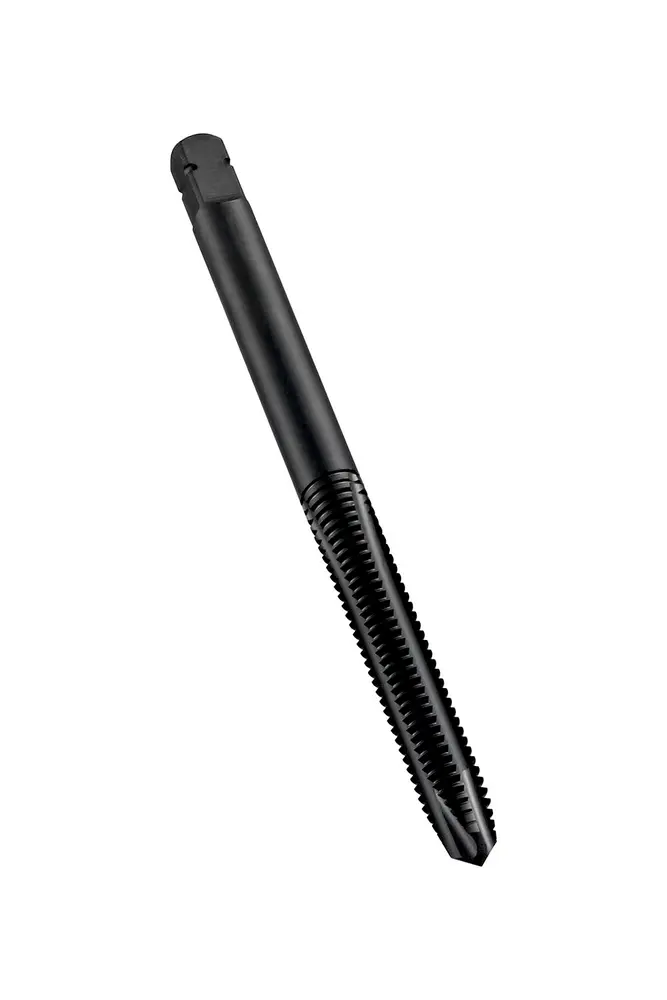 Метчик со спиральной подточкой и фаской формы B, со вторым заходом 3,5-5xP, для метрической резьбы ISO M2,5 с шагом 0,45 мм и классом точности 6H, размеры по стандарту ISO 529, с хвостовиком 2,8 мм и квадратным приводным отверстием 2,24 мм, из порошковой стали HSS-E с обработанной паром поверхностью для нарезания резьбы сквозными отверстиями диаметром 2,5xD общего назначения.