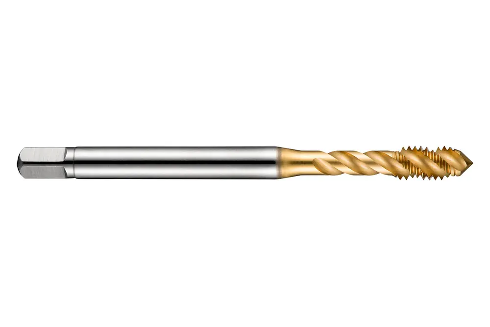Метчик со спиральной канавкой и фаской формы C, с шагом 2-3xP, для метрической резьбы ISO M16 с шагом 2,00 мм и классом точности 6H, размеры по стандарту ISO 529, с хвостовиком 12,5 мм и квадратным приводом 10,0 мм, из порошковой стали HSS-E с покрытием TiN и углом наклона винтовой линии 45° для нарезания резьбы в глухих отверстиях диаметром 2,5xD в автоматической обработке на станке, из обычной углеродистой и легированной стали, ферритной, мартенситной и аустенитной нержавеющей стали и литого алюминия.