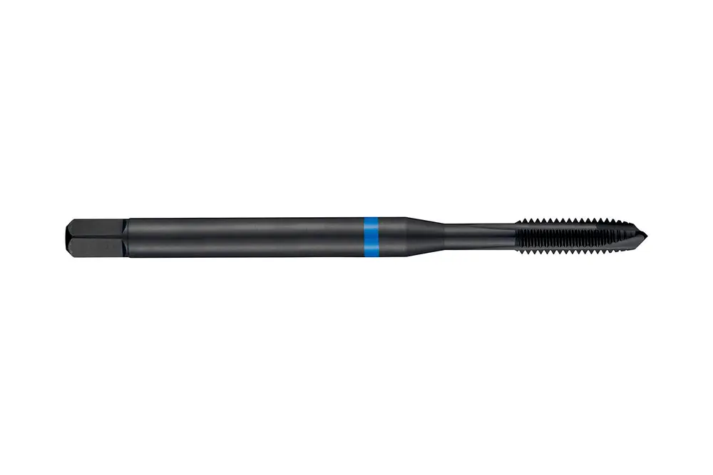 Метчик со спиральной головкой Blue Shark с фаской формы B, вторым заходом 3,5-5xP, для метрической резьбы ISO M10 с шагом 1,50 мм и классом точности 6H, размеры по стандарту DIN 371, с хвостовиком 10,0 мм и квадратным приводом 8,0 мм, изготавливается из порошковой стали HSS-E с обработанной паром поверхностью для нарезания сквозной резьбы 2,5xD в нержавеющей стали.