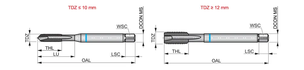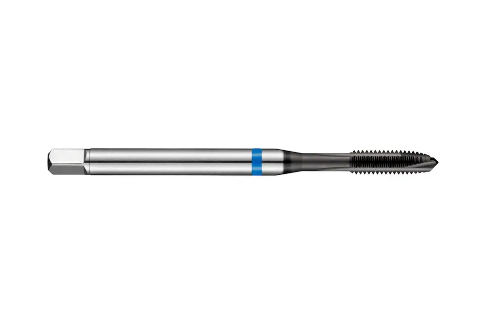 Метчик Blue Shark со спиральной головкой, фаской формы B, вторым заходом 3,5-5xP, для метрической резьбы ISO M4 с шагом 0,70 мм и классом точности 6H, размеры по стандарту DIN 371, с хвостовиком 4,5 мм и приводным квадратом 3,4 мм, из порошковой металлургии HSS-E с покрытием Super-B для нарезания сквозной резьбы 2,5xD в ферритной, мартенситной и аустенитной нержавеющей стали.