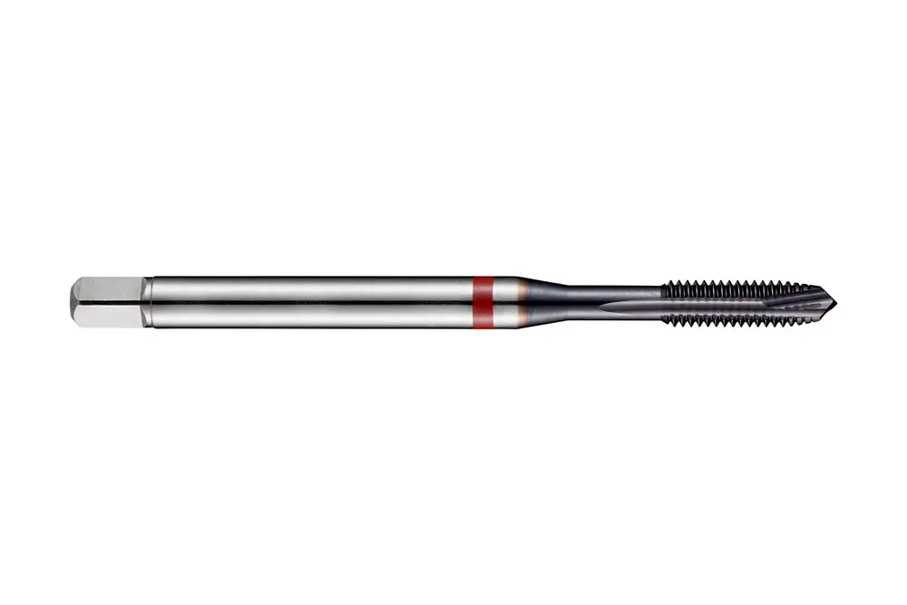 Метчик Red Shark со спиральной канавкой, фаской формы B, вторым заходом 3,5-5xP, для метрической резьбы ISO M5 с шагом 0,80 мм и классом точности 6H, размеры по стандарту DIN 371, с хвостовиком 6,0 мм и квадратным приводом 4,9 мм, из порошковой металлургии HSS-E с покрытием TiAlN-Top для нарезания сквозной резьбы 2,5xD в углеродистой, легированной и инструментальной стали.