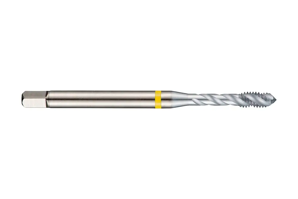 Метчик со спиральной канавкой Yellow Shark с фаской формы C, с направляющей планкой 2-3xP, для метрической резьбы ISO M3 с шагом 0,50 мм и классом точности 6H, размеры по стандарту DIN 371 с хвостовиком 3,5 мм и квадратным приводом 2,7 мм, из порошковой стали HSS-E с блестящей хромированной поверхностью и углом наклона винтовой линии 40° для нарезания резьбы в глухих отверстиях 2xD в станках с ЧПУ и в изделиях из углеродистой стали, меди или медных сплавов.