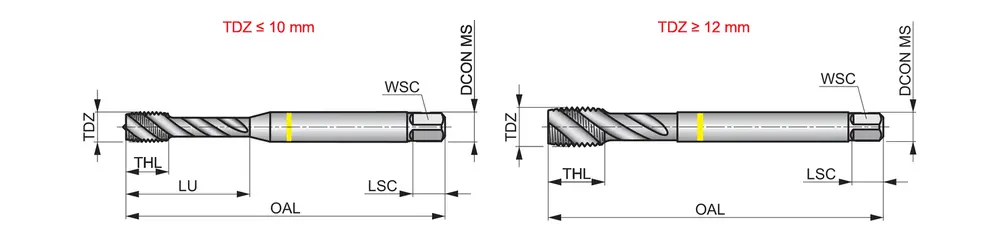 Метчик со спиральной канавкой Yellow Shark с фаской формы C, с направляющей втулкой 2-3xP, для метрической резьбы ISO M8 с шагом 1,25 мм и классом точности 6H, размеры по стандарту DIN 371 с хвостовиком 8,0 мм и квадратным приводом 6,2 мм, из порошковой стали HSS-E с блестящей хромированной поверхностью и углом наклона винтовой линии 40° для нарезания резьбы в глухих отверстиях 2xD в стали с автоматической и обычной обработкой на станке, а также в углеродистой стали и меди или медных сплавах.