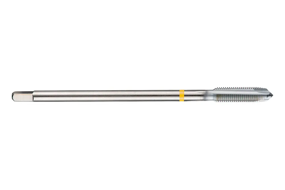 Метчик Yellow Shark со спиральной канавкой, фаской формы B, вторым заходом 3,5-5xP, для метрической мелкой резьбы ISO M30 с шагом 2,00 мм и классом точности 6H, размеры по стандарту DIN 374, с хвостовиком 22,0 мм и квадратным приводом 18,0 мм, из порошковой металлургии HSS-E с блестящей хромированной поверхностью для нарезания резьбы 2,5xD в сквозных отверстиях из стали, обработанной на станке, и углеродистой стали, меди или медных сплавов.