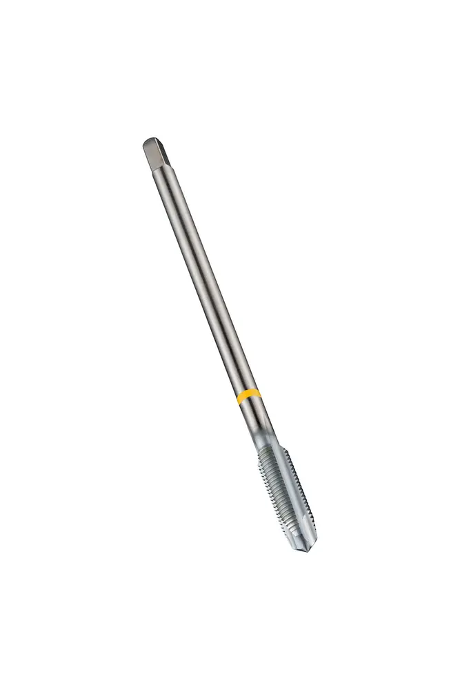 Метчик Yellow Shark со спиральной канавкой, фаской формы B, со вторым заходом 3,5-5xP, для метрической мелкой резьбы ISO M5 с шагом 0,50 мм и классом точности 6H, размеры по стандарту DIN 374, с хвостовиком 3,5 мм и квадратным приводом 2,7 мм, из порошковой металлургии HSS-E с блестящей хромированной поверхностью для нарезания резьбы 2,5xD в сквозных отверстиях из стали, обработанной на станке, и обычной углеродистой стали, меди или медных сплавов.