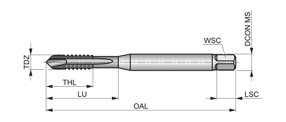 Метчик спиральный с фаской формы B, со вторым заходом 3,5-5xP, для метрической резьбы ISO M4 с шагом 0,70 мм и классом точности 6H, размеры по стандарту DIN 371, с хвостовиком 4,5 мм и квадратным приводом 3,4 мм, из порошковой стали HSS-E с покрытием TiN для нарезания сквозной резьбы 3xD в автоматически обрабатываемых деталях из углеродистой и легированной стали, а также из деформируемых сталей, меди и медных сплавов.