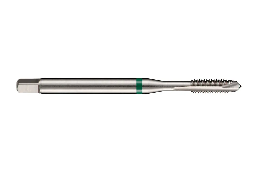 Метчик со спиральной головкой Green Shark с фаской формы B, вторым заходом 3,5-5xP, для метрической резьбы ISO M4 с шагом 0,70 мм и классом точности 6H, размеры по стандарту DIN 371, с хвостовиком 4,5 мм и приводным квадратом 3,4 мм, изготавливается методом порошковой металлургии из быстрорежущей стали HSS-E с блестящей поверхностью для нарезания сквозной резьбы 2,5xD в цветных металлах.