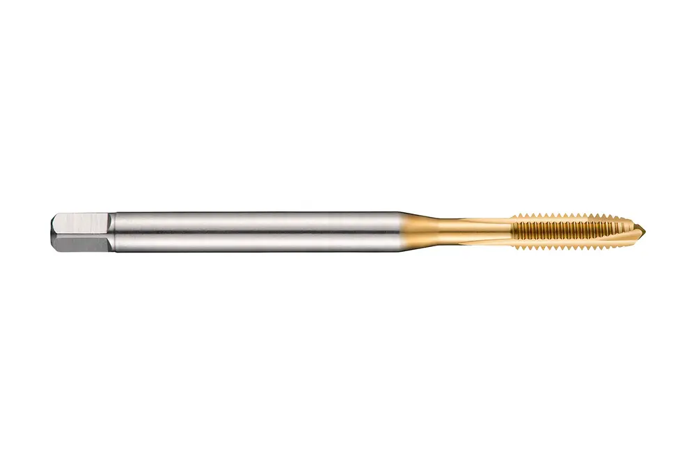 Метчик спиральный с фаской формы B, со вторым заходом 3,5-5xP, для метрической резьбы ISO M5 с шагом 0,80 мм и классом точности 6H, размеры по стандарту DIN 371, с хвостовиком 6,0 мм и квадратным приводом 4,9 мм, из порошковой металлургии HSS-E с покрытием TiN для нарезания резьбы 2,5xD в сквозных отверстиях в стали и стальном литье, ферритной, мартенситной и аустенитной нержавеющей стали, а также деформируемом или литом алюминии.
