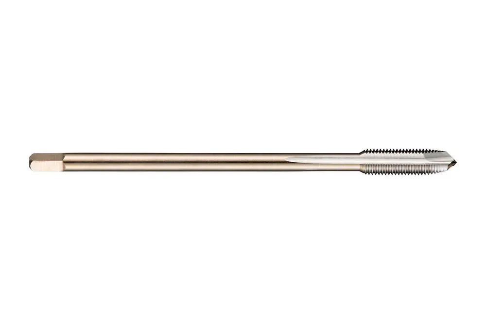 Метчик со спиральной подточкой и фаской формы B с шагом 3,5-5xP, для метрической мелкой резьбы ISO M10 с шагом 0,75 мм и классом точности 6H, размеры по стандарту DIN 374, с хвостовиком 7,0 мм и квадратным приводом 5,5 мм, из порошковой металлургии HSS-E с блестящей поверхностью для нарезания сквозной резьбы 2,5xD в станках с ЧПУ, из углеродистой и легированной стали, а также из деформируемого или литого алюминия.