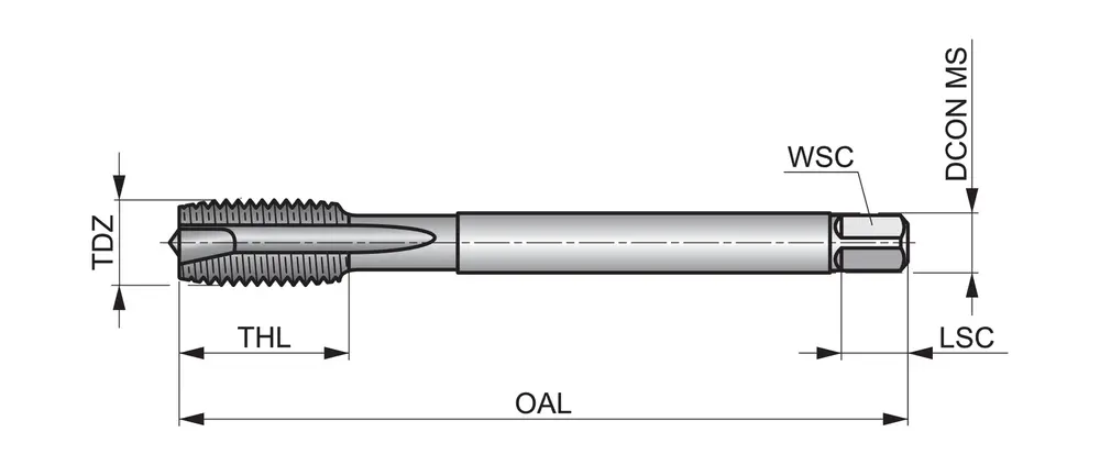 Метчик со спиральной подточкой и фаской формы B с заходной частью 3,5-5xP, для метрической мелкой резьбы ISO M10 с шагом 1,25 мм и классом точности 6H, размеры по стандарту DIN 374, с хвостовиком 7,0 мм и квадратным приводом 5,5 мм, из порошковой металлургии HSS-E с блестящей поверхностью для нарезания сквозной резьбы 2,5xD в станках с ЧПУ, из углеродистой и легированной стали, а также из деформируемого или литого алюминия.