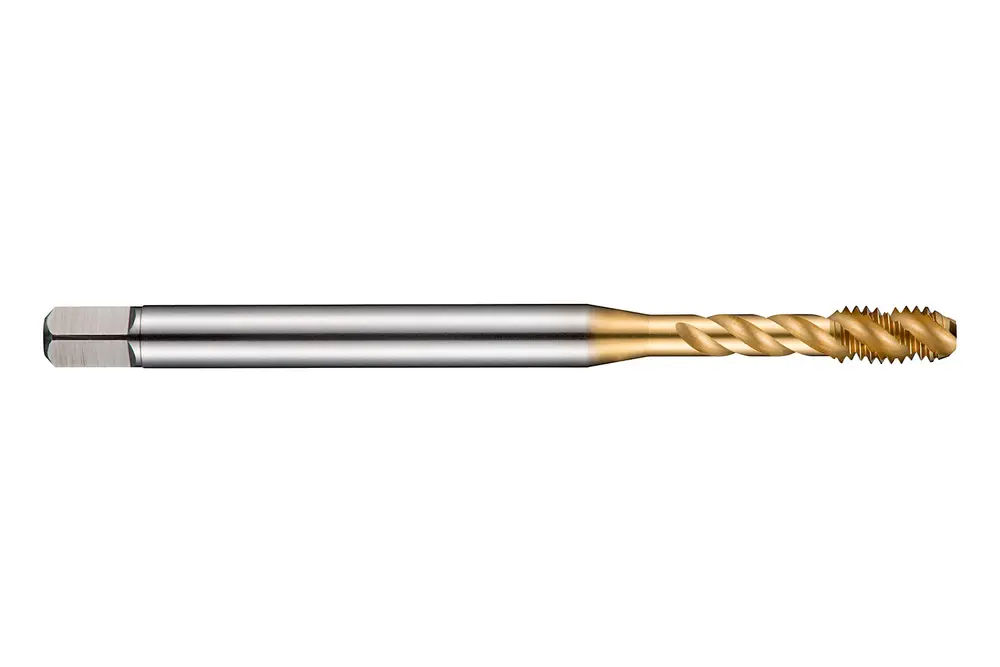 Метчик со спиральной канавкой и фаской формы C, с шагом 2-3xP, для метрической резьбы ISO M27 с шагом 3,00 мм и классом точности 6H, размеры по стандарту DIN 376, с хвостовиком 20,0 мм и квадратным приводом 16,0 мм, из порошковой стали HSS-E с покрытием TiN и углом наклона винтовой линии 45° для нарезания резьбы в глухих отверстиях диаметром 2,5xD в стали и стальном литье, ферритной, мартенситной и аустенитной нержавеющей стали и алюминиевом литье.