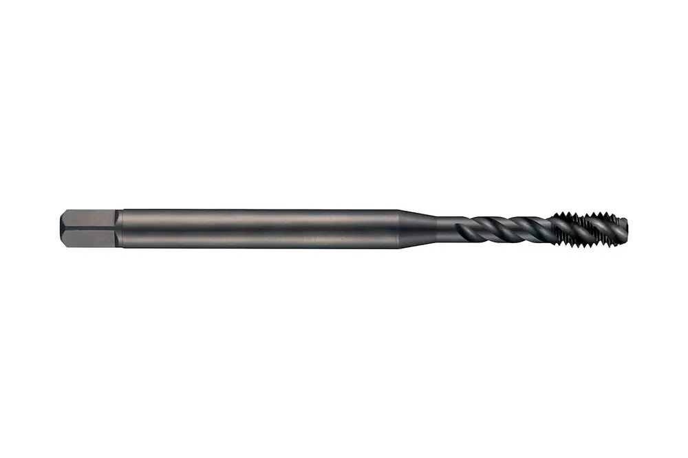Метчик со спиральной канавкой и фаской формы C, с шагом 2-3xP, для метрической резьбы ISO M7 с шагом 1,00 мм и классом точности 6H, размеры по стандарту DIN 371, с хвостовиком 7,0 мм и квадратным приводом 5,5 мм, из порошковой стали HSS-E с закаленной паром поверхностью и углом наклона винтовой линии 45° для нарезания резьбы в глухих отверстиях диаметром 2,5xD общего назначения.